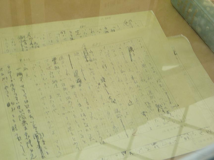 | 「赤毛のアンの庭」も混雑がひどくて写真はあきらめたけど、村岡花子の原稿があった。「アンを行かせてやらにゃいかんよ、マリラ」(140519) | ||