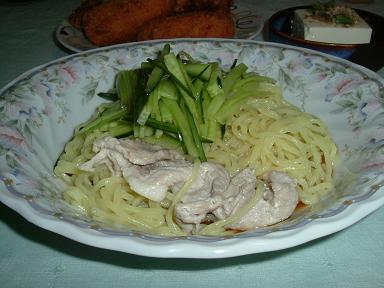 具はきゅうりと、冷凍庫にあって麺と一緒にゆでた豚肉のみ。ほんとはたまごとかしいたけとかチャーシューとか紅生姜かな。 (070806) |