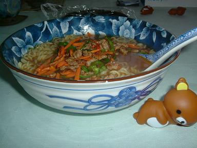 ひき肉とニンジン、ピーマンを塩コショウ、豆板醤で炒めたのをのっけた。写真はまずそうだけどおいしかった。 (070817) |