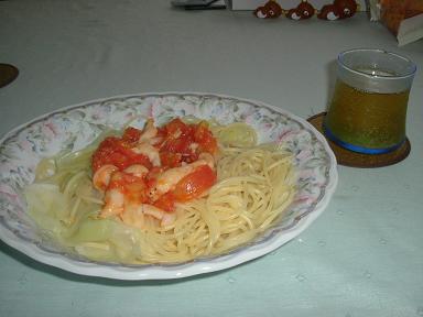 しめじとトマトをにんにく、しょうがで炒めて、のっけた。キャベツも麺と一緒にゆでてみた。 (070827) |