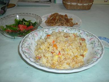 ほんと、チャーハンばっかし。下のはウィンナーを入れてみたもの。これはキャベツと、焼き鮭をほぐしてまぜてみたもの。こうして見ると、お皿の違いくらいしかわからないや。でもおいしかった。 (071209) |